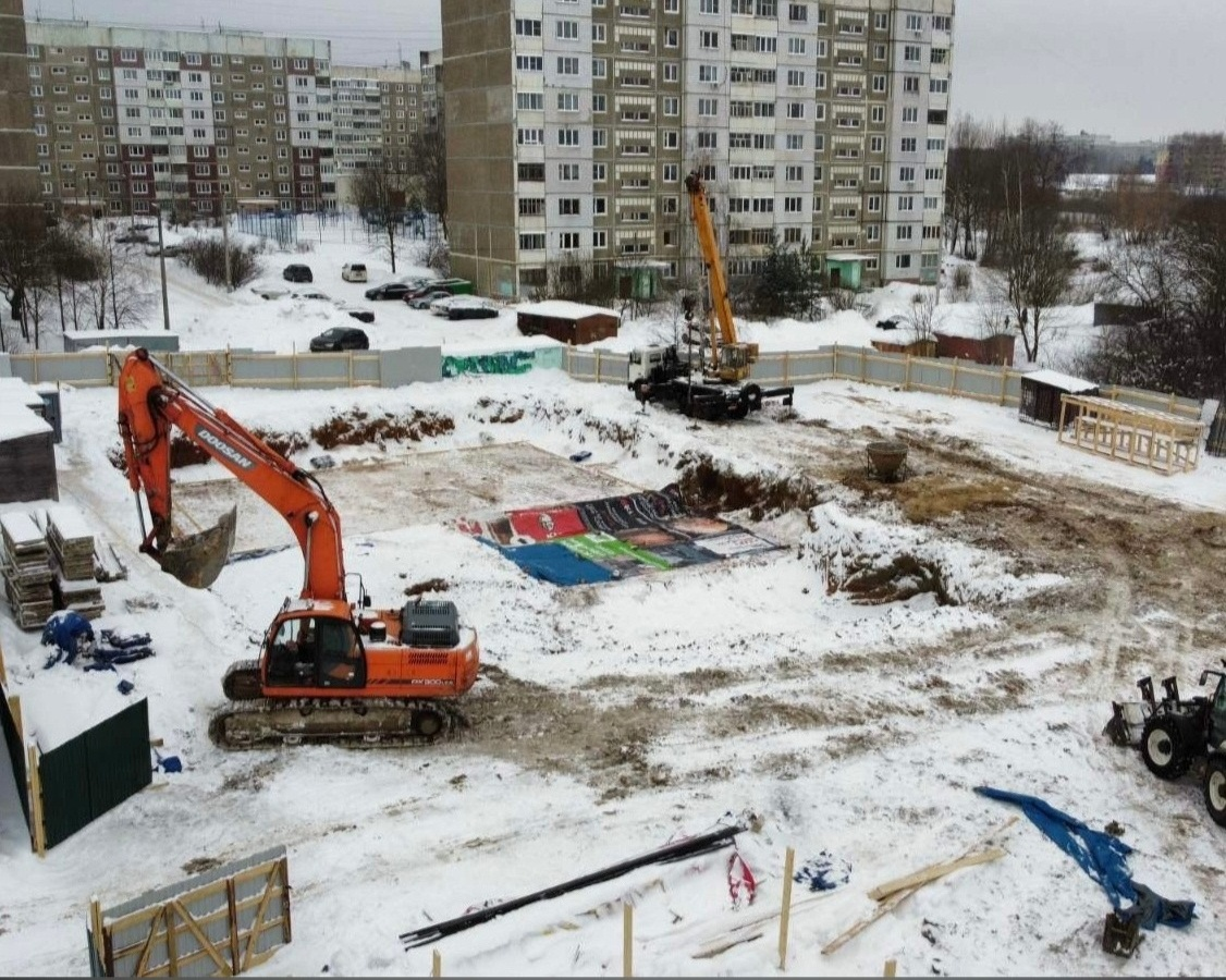 Строительство на стадии подготовки основания под дальнейшую заливку фундамента.